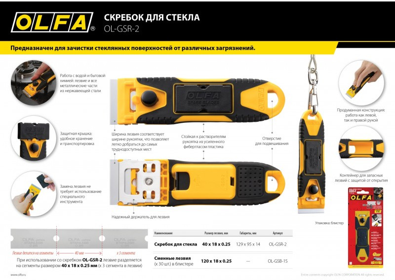 При использовании со скребком OLFA GSR-2 лезвие разделяется на сегменты размером 40 x 18 x 0.25 мм (x 3 сегмента в лезвии).