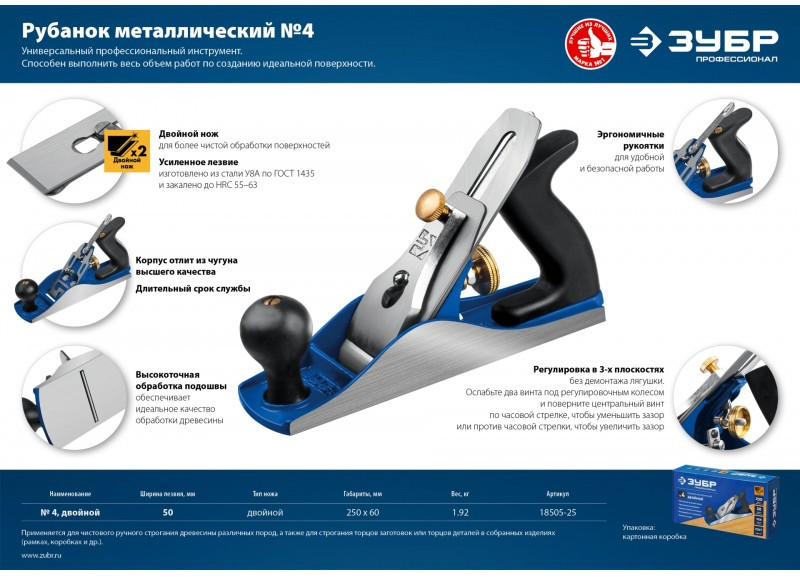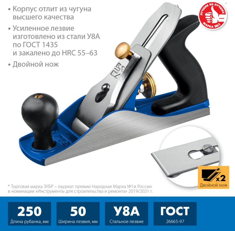 Рубанок металлический Зубр № 4 ДВОЙНОЙ 250х60 мм [18505-25_z02]