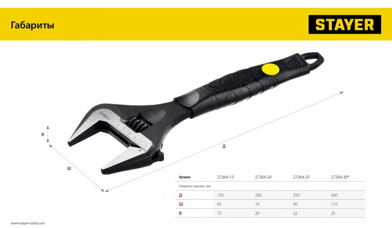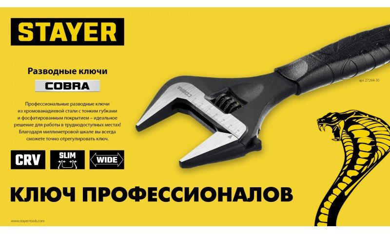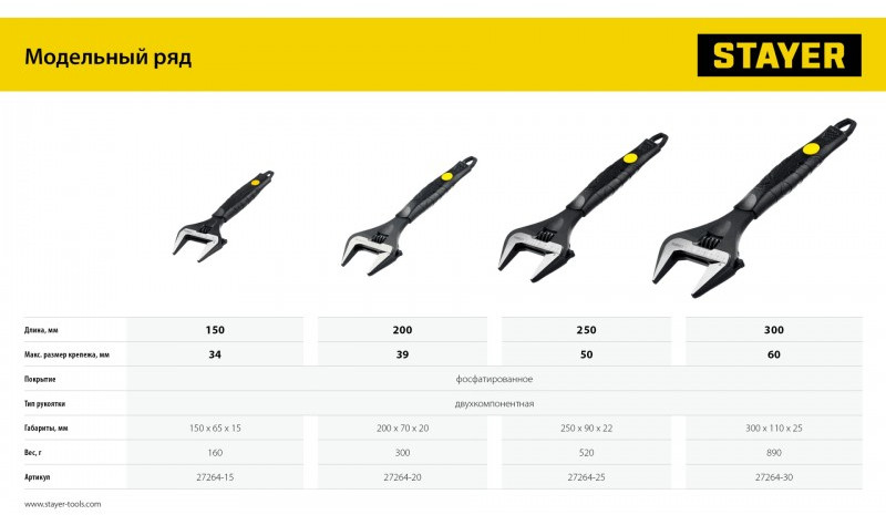 Профессиональные разводные ключи STAYER предназначены для завинчивания гаек, болтов и других деталей, изготовлены из высококачественной хромованадиевой стали, снабжен миллиметровой измерительной шкалой и фосфатированным покрытием, а благодаря наличию тонких губок, инструмент удобен для выполнения работ в труднодоступных местах.