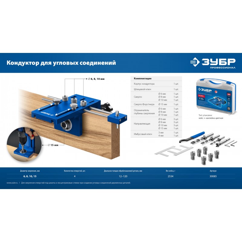 Кондуктор для угловых соединений Зубр 30085 4 отверстия, в кейсе, Профессионал