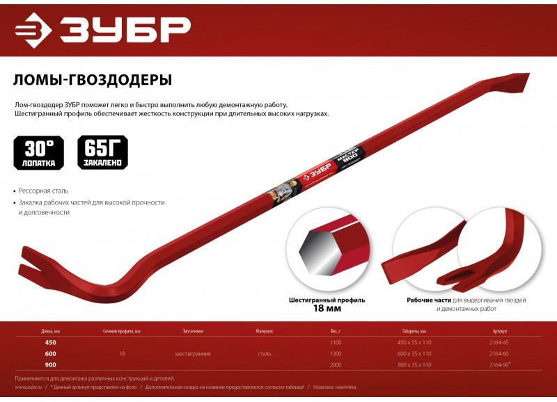 Профессиональный инструмент для демонтажных работ «ЗУБР» выдерживает длительные высокие нагрузки, обладает высоким ресурсом, имеет длительный срок службы и обеспечивает качественную работу.