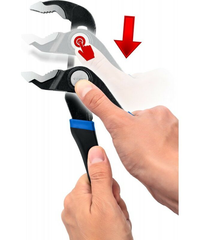 - Уникальная конструкция шарнира с кнопочным фиксатором обеспечивает быстрый подбор ширины зева.