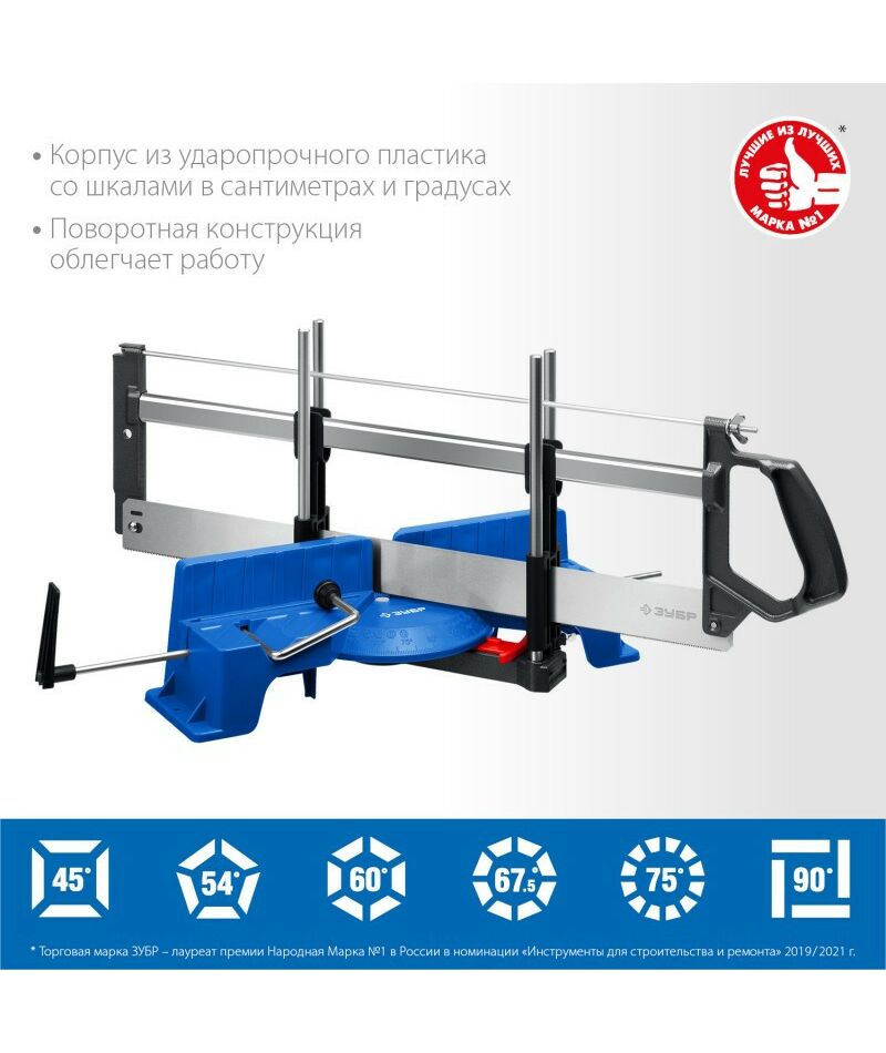 Обладает поворотной конструкцией, облегчающей работу с заготовками из древесины и прочих материалов. Имеет все необходимые для работы углы пиления в 45, 54(36) 60(30) 67,5(22,5) градусов.
