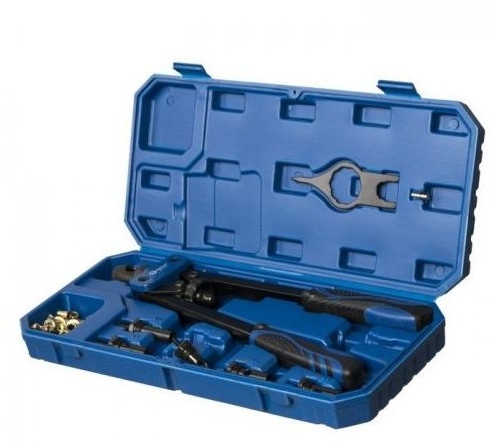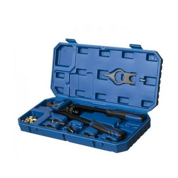 Заклепочник для резьбовых заклепок двуручный профессиональный 360 мм КОБАЛЬТ 243-578 предназначен для скрепления листовых материалов с помощью резьбовых заклепок из алюминия, латуни или нержавеющей стали с резьбой M3 - M10. Легкий литой алюминиевый корпус с стальным рычажным механизмом и обрезиненными рукоятками для комфортной работы. В комплекте 6 резьбовых насадок под заклепки с резьбой М3, М4, М5, М6, М8, М10, монтажный ключ, кейс.
