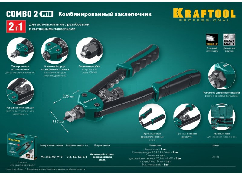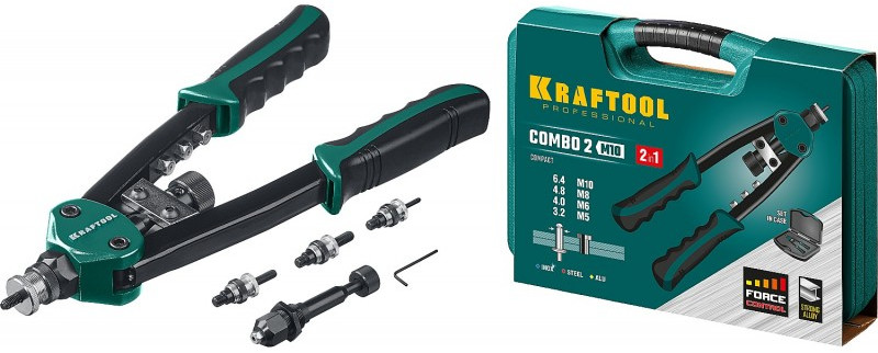 Комбинированный компактный двуручный заклепочник KRAFTOOL Combo2-M10 в кейсе [31181]