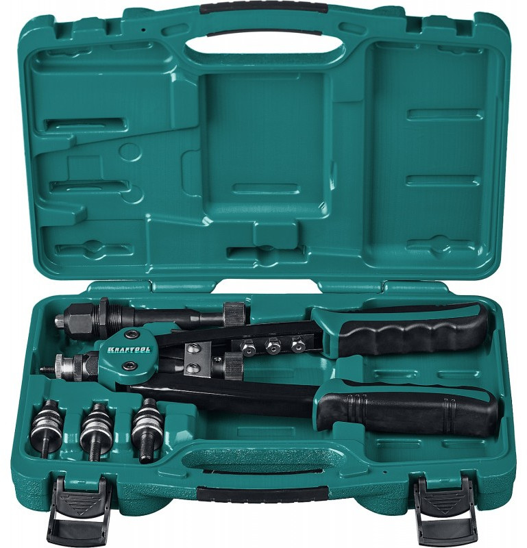 - Комбинированный двуручный заклепочник KRAFTOOL - максимально компактный и надежный инструмент, который с легкостью выдерживает высокие нагрузки и предназначен для установки резьбовых и вытяжных заклепок из алюминия, стали и нержавеющей стали.