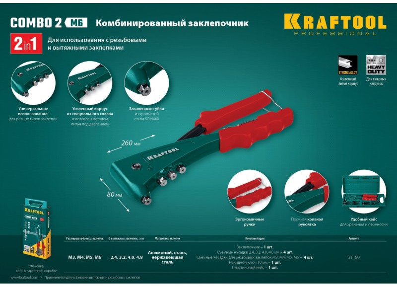 - Комбинированный заклепочник KRAFTOOL выдерживает высокие рабочие нагрузки и предназначен для установки резьбовых и вытяжных заклепок из алюминия, стали и нержавеющей стали.