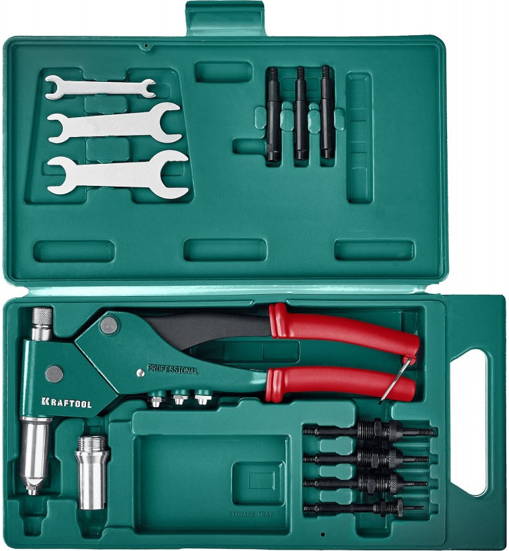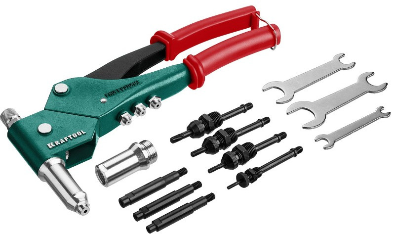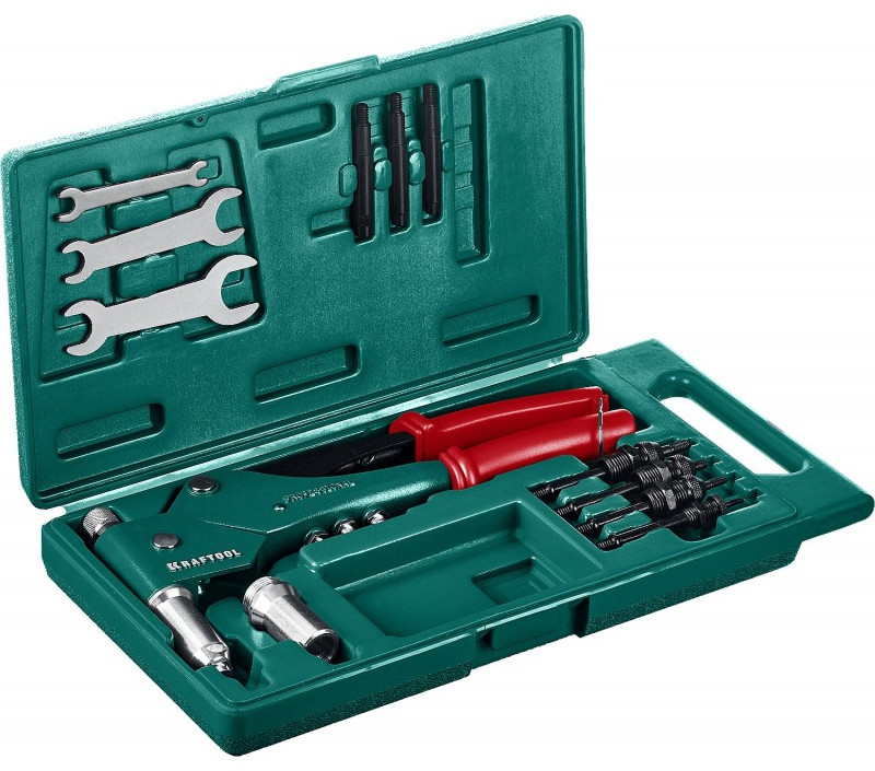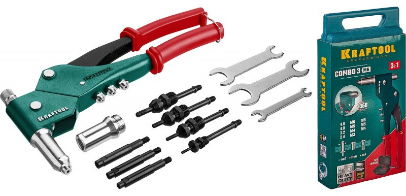 - Комбинированный поворотный заклепочник KRAFTOOL выдерживает высокие рабочие нагрузки и предназначен для установки резьбовых штифтов, резьбовых и вытяжных заклепок из алюминия, стали и нержавеющей стали различных диаметров согласно вложенной таблице.