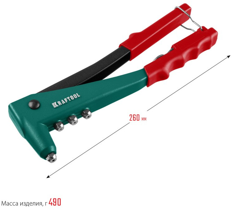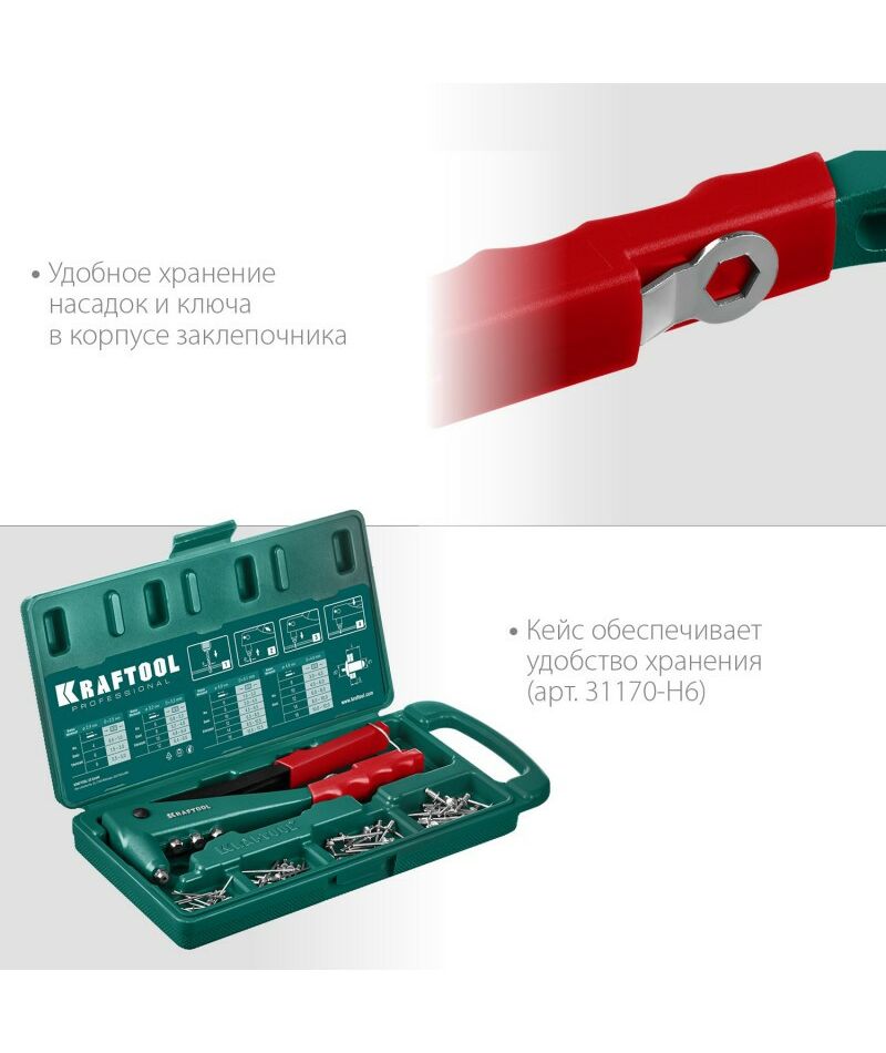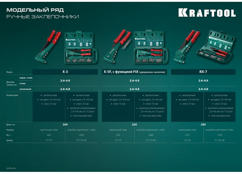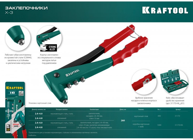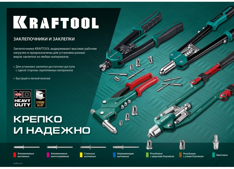 Заклепочник KRAFTOOL выдерживает высокие рабочие нагрузки и предназначен для установки заклепок из алюминия, стали и нержавеющей стали различных диаметров согласно таблице.