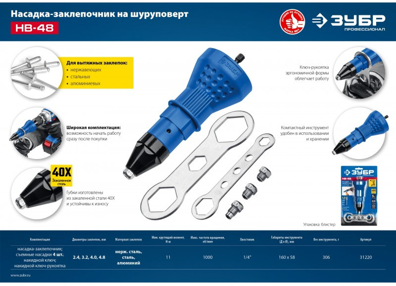 - Тип заклепочника: насадка на шуруповерт