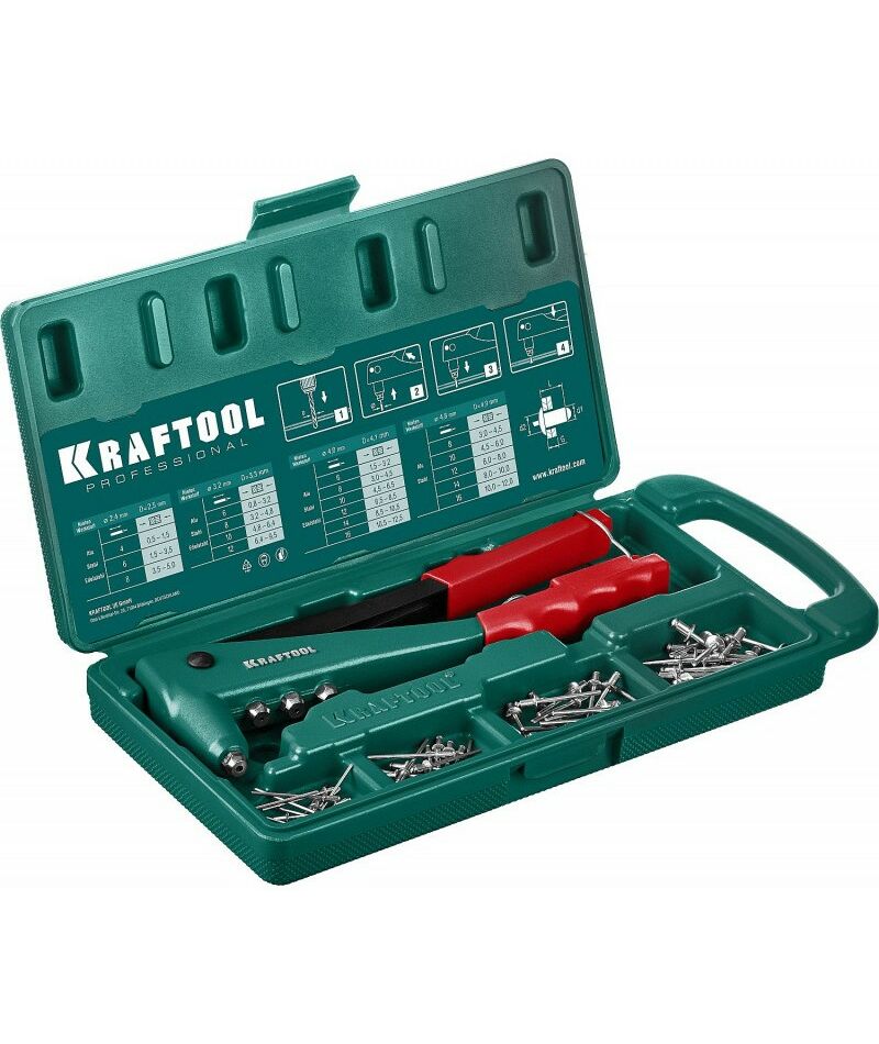 Заклепочник KRAFTOOL выдерживает высокие рабочие нагрузки и предназначен для установки заклепок из алюминия, стали и нержавеющей стали различных диаметров согласно таблице.