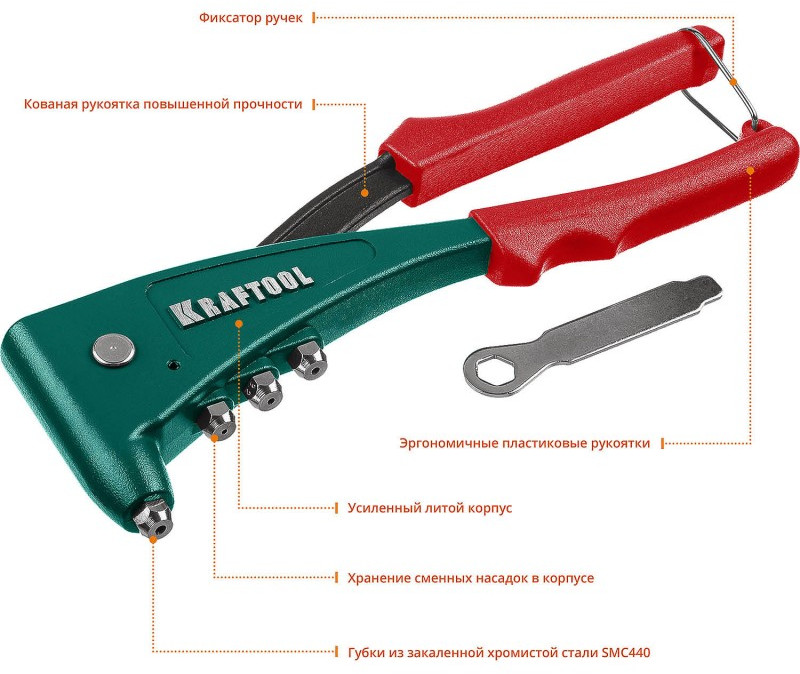 Заклепочник KRAFTOOL выдерживает высокие рабочие нагрузки и предназначен для установки заклепок из алюминия, стали и нержавеющей стали различных диаметров согласно таблице.