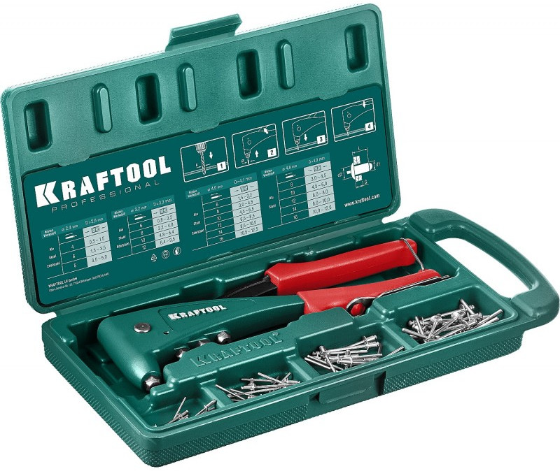 Заклепочник KRAFTOOL выдерживает высокие рабочие нагрузки и предназначен для установки заклепок из алюминия, стали и нержавеющей стали различных диаметров согласно таблице.