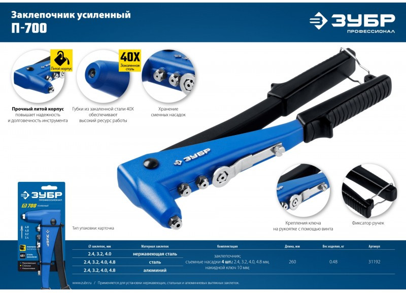 - Диаметры заклепок, мм: 2.4, 3.2, 4.0, 4.8