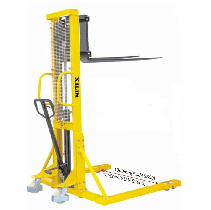 Ручные штабелеры марки Xilin зарекомендовали себя только с хорошей стороны. В модельном ряду найдутся как экономичные модели, так и модели для интенсивных нагрузок. Ручной штабелер XILIN SDJAS500/1000/1500 — Серия ручных штабелеров с расширенными опорами. Благодаря такой компоновке опор штабелер более устойчив и вдобавок у него вилы опускаются ниже, так как они опускаются между опор, а не на них и поэтому высота подхвата составляет 70 мм, при обычной для штабелеров высоте подхвата 85-90 мм. Данная модель обладает грузоподъемность 1000 кг и высотой подъема 1,6 метра.