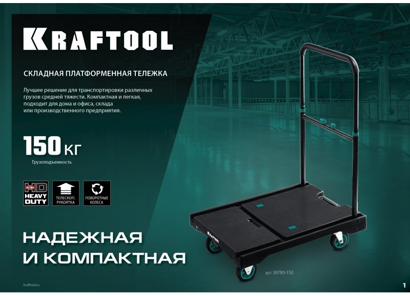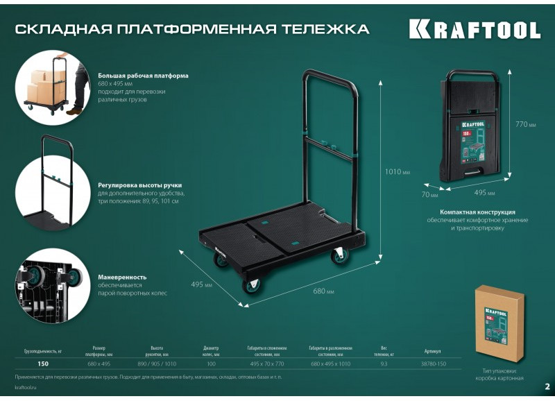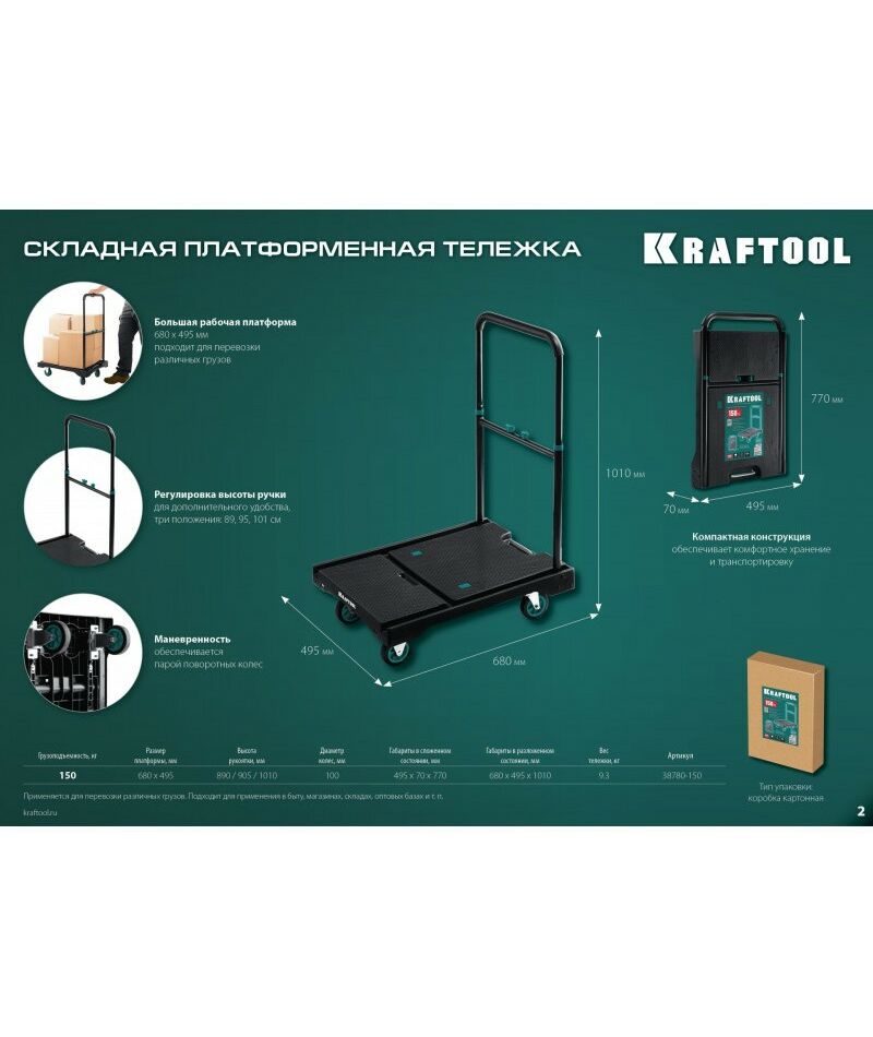 Платформенная тележка KRAFTOOL до 150 кг платформа 68.0 х 49.5см, складная рукоятка, складные колёса d10см, вес 9.3кг [38780-150]