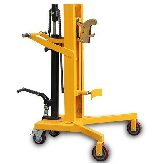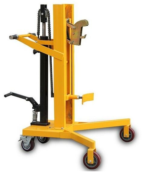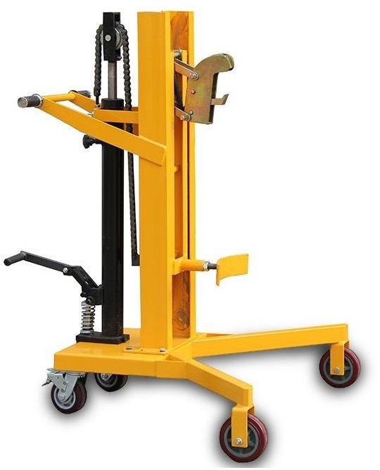 Тележка состоит из следующих элементов: металлическая прочная рама, ручки для управления тележкой, гидравлический насос подъема, ножная педаль подъема, упор для бочки, автоматический замок захвата бочки за верхнюю кромку, 3 колеса (рулевое колесо с тормозом). Высота подъема бочки 600 мм, что позволяет работать с любыми паллетами.