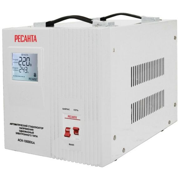 - Стабилизатор напряжения Ресанта АСН 10000БА релейного типа предназначен для выравнивания входного напряжения и защиты приборов от перепадов напряжения с суммарной мощностью до 10 кВт. Работает с напряжением 220В с точностью до +/-8%. Устройство оснащено фильтрами сетевых помех, предотвращающими искажение частотной синусоиды, микропроцессорным управлением и цифровым индикатором напряжения, на котором отображаются параметры напряжения. Превышение пределов поддерживаемого входного напряжения автоматически отключает подачу питания. Прочный корпус защищает внутренние узлы аппарата от повреждений. Данный стабилизатор может обеспечивать стабильным питанием - телевизор, ресивер, DVD проигрыватель, кассовый аппарат, газовый котел.