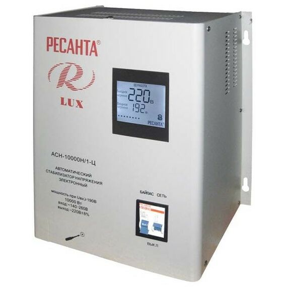 Однофазный цифровой стабилизатор Ресанта АСН-10000Н/1-Ц - это бытовой прибор, к которому можно подключить потребитель мощностью до 10000 Вт. Прибор обеспечивает сохранность потребителя в случае скачков напряжения в сети электроснабжения или при коротком замыкании. Стабилизатор АСН-10000Н/1-Ц стоит купить, ведь его можно разместить в любом удобном месте, например на компьютерном столе или на кухне, для подключения бытовой техники.