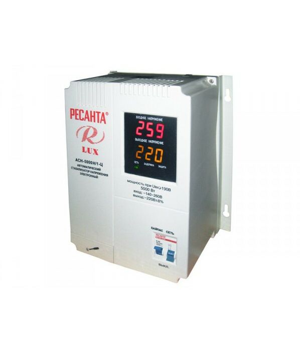 Однофазный цифровой стабилизатор Ресанта АСН-5000Н/1-Ц - это бытовой прибор, к которому можно подключить потребитель мощностью до 5000 Вт. Прибор обеспечивает сохранность потребителя в случае скачков напряжения в сети электроснабжения или при коротком замыкании. Стабилизатор АСН-5000Н/1-Ц стоит купить, ведь его можно разместить в любом удобном месте, например на компьютерном столе или на кухне, для подключения бытовой техники.