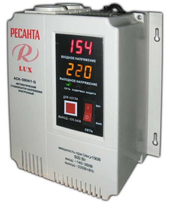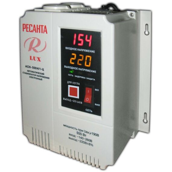 - Стабилизатор серии LUX РЕСАНТА АСН-500 Н/1-Ц - однофазный релейный стабилизатор для размещения на стене. Устройство выравнивает входящее напряжение и защищает электрические приборы от высоких скачков напряжения с суммарной мощностью до 0.5 кВт. Благодаря металлическому корпусу внутренние узлы защищены от механических повреждений. Стабилизатор Ресанта оснащен цифровым дисплеем, показывающим основные параметры работы. Для более эффективного охлаждения в конструкции прибора предусмотрен вентилятор. С помощью функции «Байпас» можно выключить устройство и подключить нагрузку в обход стабилизатора к питающей сети одним нажатием кнопки.