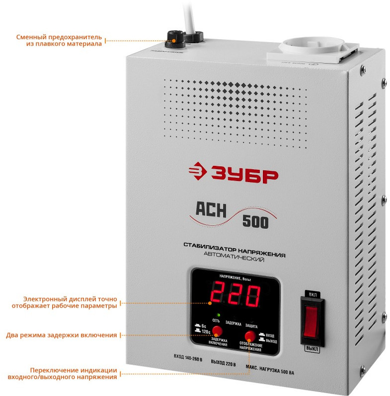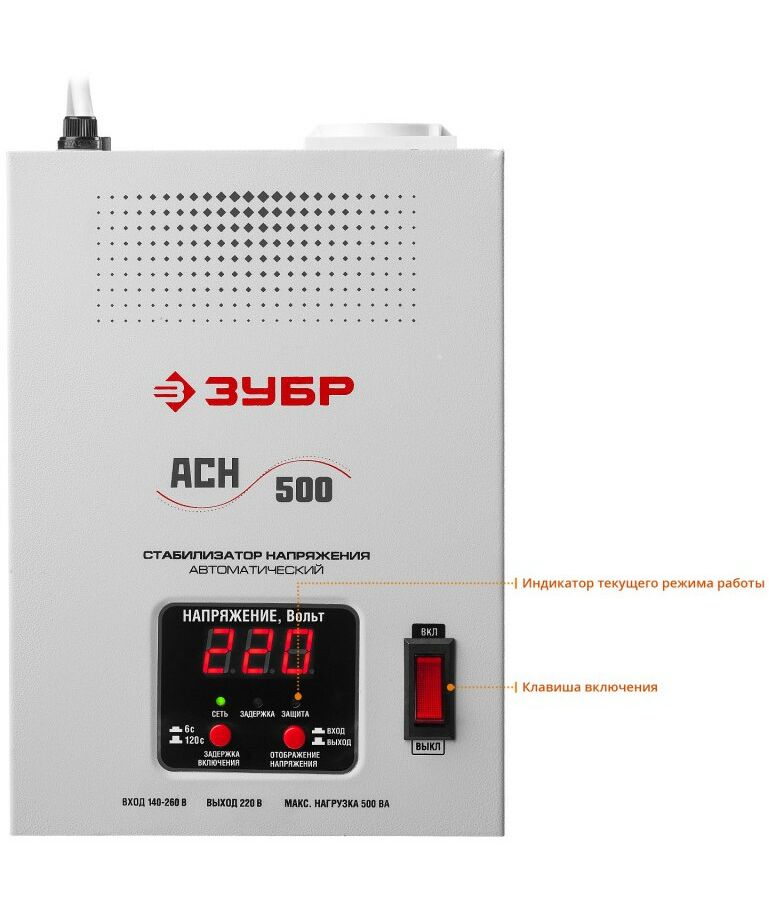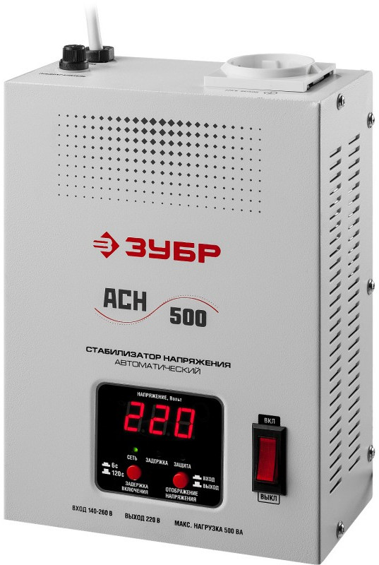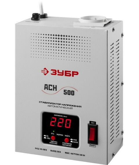 Профессиональный стабилизатор напряжения навесной Зубр АСН 500 500 ВА, 140-260 В, 8% [59381-0.5]