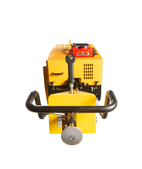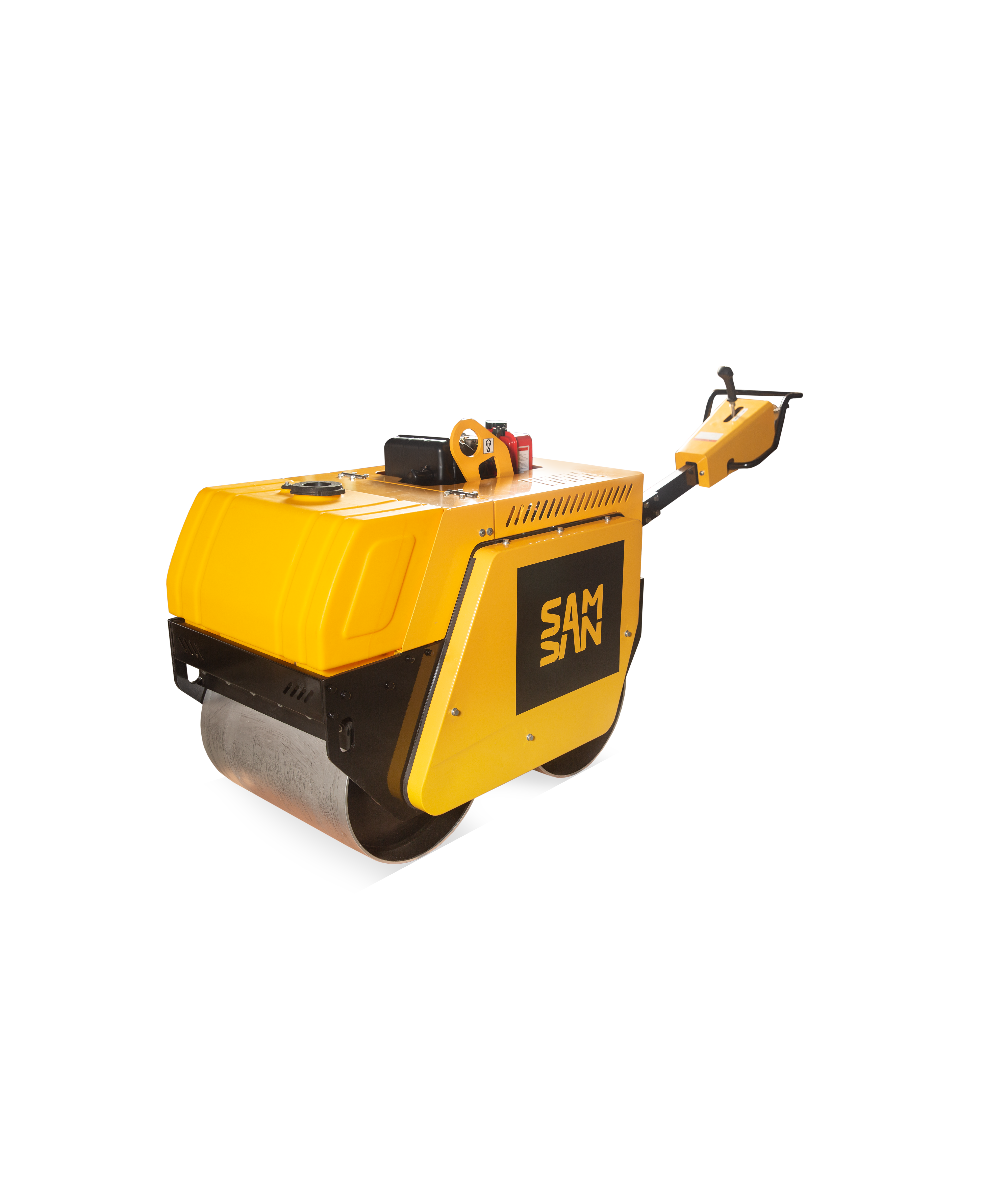 Двухвальцовый ручной каток, c плавной регулировкой скоростью движения от 0 до 3 км/ч при помощи гидроузла японского производства и электромагнитной муфтой, которая позволяет включить и выключить вибрацию на заднем вальце простым нажатием кнопки на рычаге управления.
