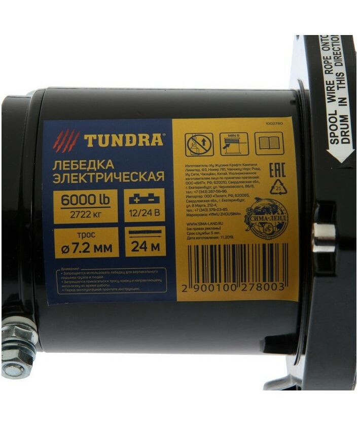 Электрическая лебёдка TUNDRA 2722 кг (6000 lb) трос 7.2 мм х 24 м, 12/24V, до 8.5 м/мин