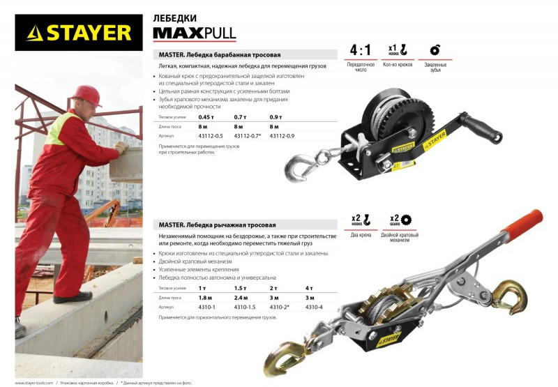 Лебедка STAYER MAXPull 4310-4 рычажная, тросовая, 4т/3м