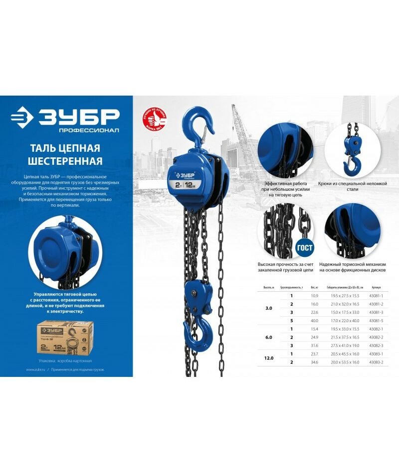 Таль цепная Зубр Профессионал ТШ-1-12 шестеренная, 1т / 12м [43083-1_z01]