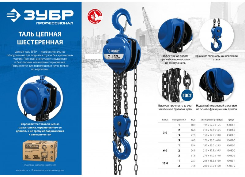 Таль цепная Зубр Профессионал ТШ-3-6 шестеренная, 3т / 6м [43082-3_z01]