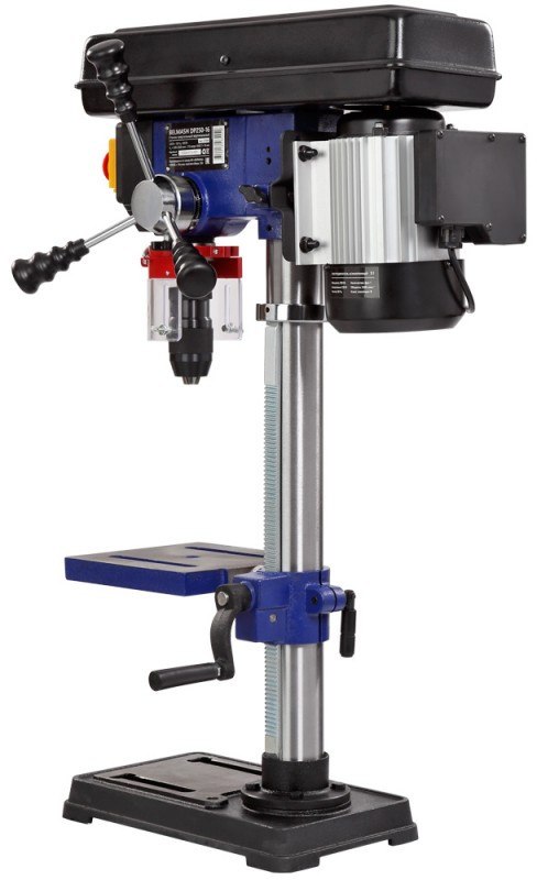 - Модель DP250-16 простая, но обладает целым рядом достоинств. Стол, опора и корпус сверлильной головки выполнены из чугуна, что придает оборудованию серьезный вес - 30 килограмм. Двигатель асинхронный, мощностью 500 Вт. Станок высокий – 855 мм, подходит для обработки заготовок большой толщины. Максимальное расстояние между шпинделем и столом – 430 мм.
