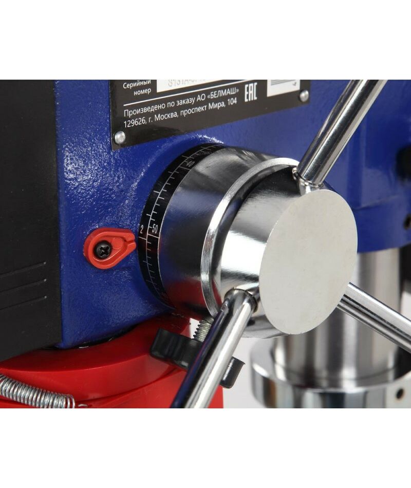 - Заготовку можно крепить как к рабочему столу, так и к основанию, все зависит от ее размера. В комплекте предусмотрены тиски. Для их крепления есть по два паза на рабочем столе и на основании. Шкала, расположенная на рукоятке регулировки глубины сверления, показывает ход пиноли шпинделя, с ее помощью можно настраивать ход пиноли, для этого необходимо провернуть шкалу, стрелка на корпусе будет показывать значение, на которое будет возможно погружение сверла, затем затянуть барашек. Наконечники тройной рукояти удобной формы, что способствует плавной подаче сверла к заготовке