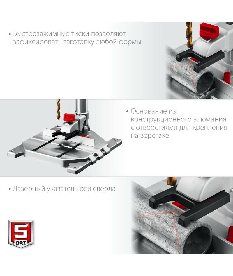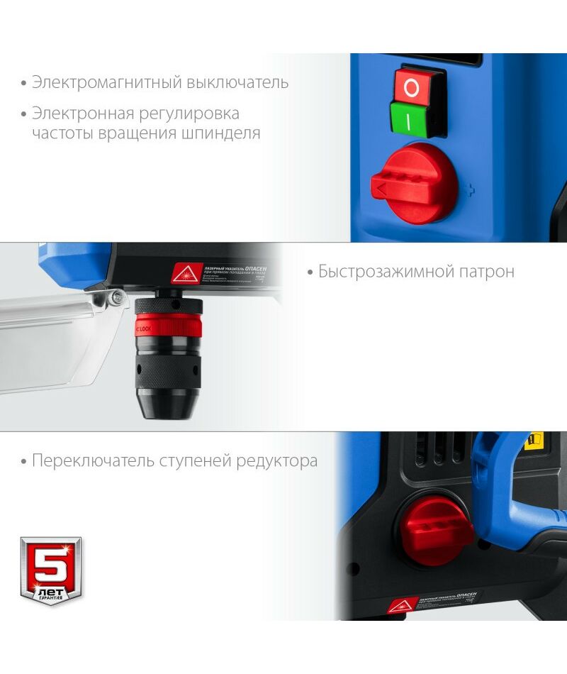 - Профессиональный сверлильный станок для точных работ. Быстрое и качественное сверление отверстий в различных материалах (при установке соответствующих типов сверл). Электронный дисплей позволяет считывать информацию о текущей скорости и глубине сверления во время эксплуатации. Быстрозажимное устройство позволяет надежно фиксировать даже круглые заготовки, обеспечивая высокую точность выполняемых отверстий. Лазерный указатель точно указывает точку вхождения сверла в материал, обеспечивая быстрое получение точного результата. LED подсветка рабочей зоны. Двухступенчатый редуктор позволяет подобрать оптимальные режимы для обрабатываемого материала.