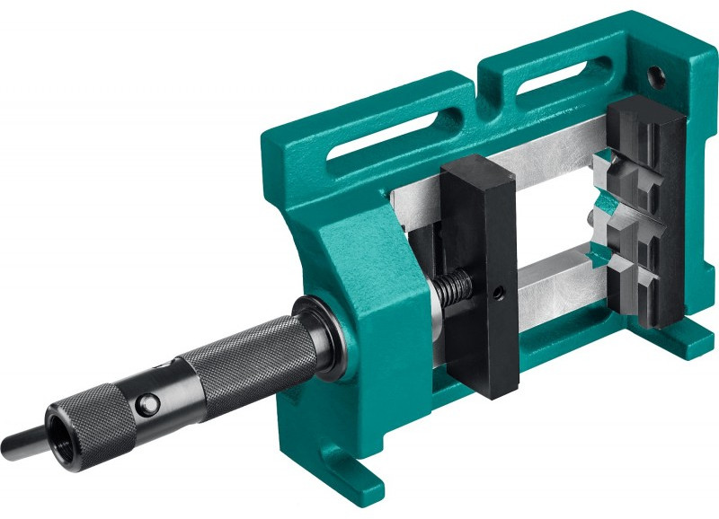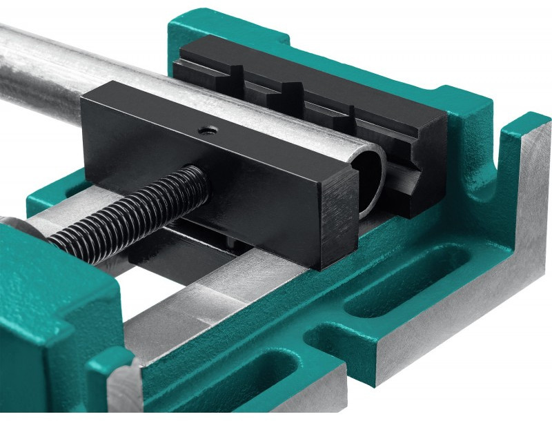 - Призматические пазы неподвижной губки позволяют зажимать горизонтально и вертикально цилиндрические заготовки