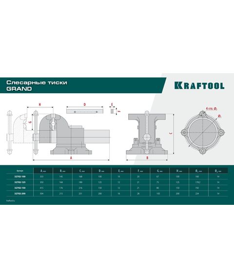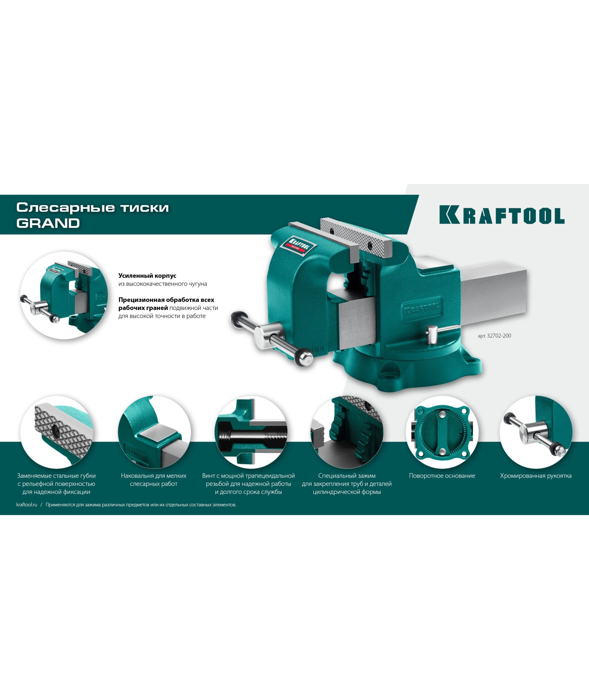 Надёжные профессиональные слесарные тиски KRAFTOOL GRAND изготовлены высококачественного чугуна с шаровидным графитом и соответствуют самым высоким техническим требованиям. Обеспечивают длительную и качественную работу. Встроенная наковальня и поворотное на 360˚ основание расширяют функционал использования инструмента.