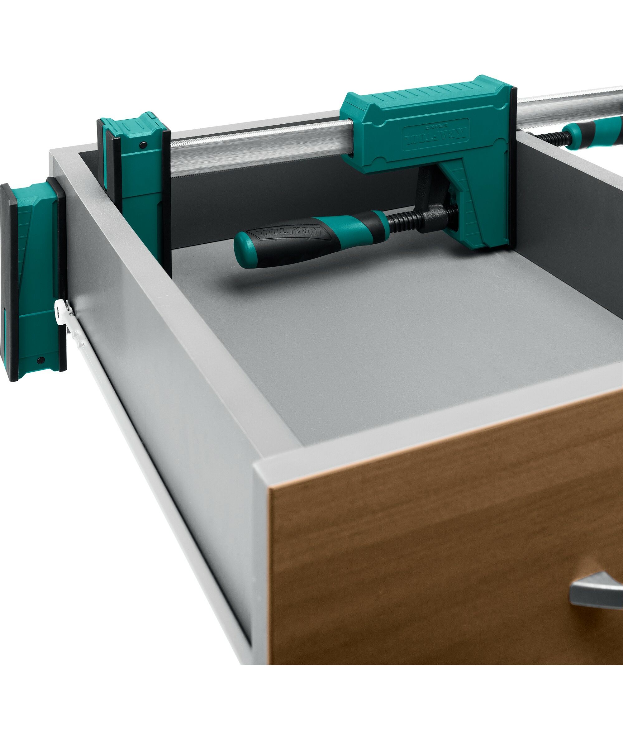 Надёжная профессиональная корпусная струбцина KRAFTOOL GRAND с постоянно параллельными губками для всевозможных столярных работ. Работа на сжатие и на распор. Бережная фиксация заготовок благодаря мягким переставным накладкам. Высокая сила сжатия. Силовые элементы из закаленной стали и высокопрочного чугуна.