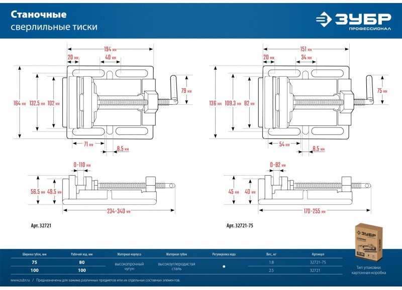 Станочные сверлильные тиски Зубр 75 мм [32721-75]