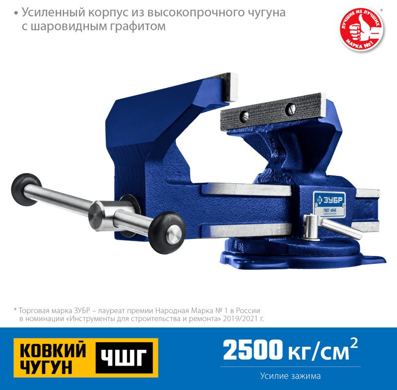 - Тиски слесарные ЗУБР изготовлены из высокопрочного чугуна с шаровидным графитом, соответствуют самым высоким техническим требованиям. Поворотное основание на 360˚. Обеспечивают длительную и качественную работу.