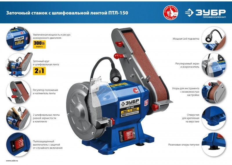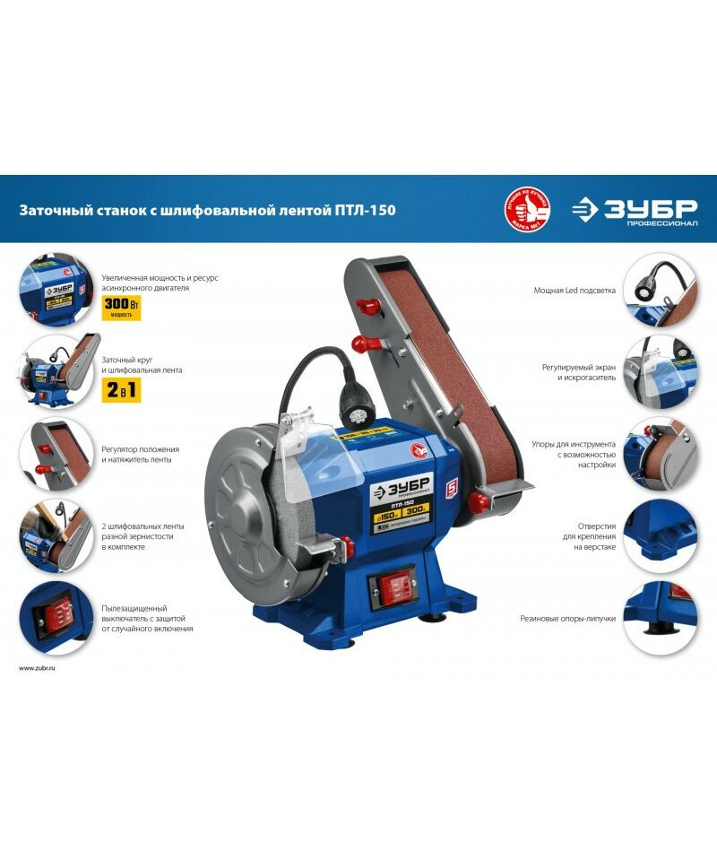 - Станок заточной ЗУБР ПТЛ-150 – незаменимый инструмент для гаража, мастерской, используемый для заточки режущего инструмента и шлифовки заготовок. Простота конструкции, высокая надежность, компактный размер, два шлифовальных материала с разной зернистостью – все что нужно для настоящего мастера, ценящего качество и рассчитывающего на долгий срок службы.
