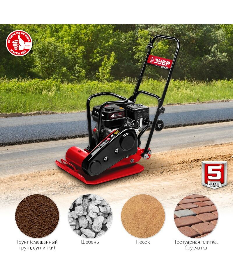 - Виброплита предназначена для уплотнения бетонных, асфальтовых и сыпучих материалов, а также для формирования уплотненных поверхностей. Компактная конструкция позволяет осуществлять уплотнение смешанного грунта в самых узких местах, даже в очень узких траншеях. Направляющая рукоятка с виброзащитой позволяет увеличить количество часов непрерывной работы и снизить усталость для оператора. Четырехтактный двигатель ″ЗУБР″ обеспечит беспроблемную эксплуатацию при минимальном сервисном обслуживании на весь срок использования.