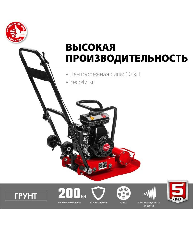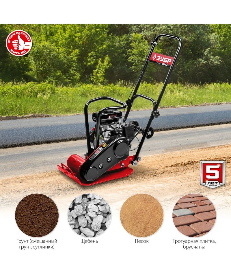 - Виброплита предназначена для уплотнения бетонных, асфальтовых и сыпучих материалов, а также для формирования уплотненных поверхностей. Компактная конструкция позволяет осуществлять уплотнение смешанного грунта в самых узких местах, даже в очень узких траншеях. Направляющая рукоятка с виброзащитой позволяет увеличить количество часов непрерывной работы и снизить усталость для оператора. Четырехтактный двигатель ″ЗУБР″ обеспечит беспроблемную эксплуатацию при минимальном сервисном обслуживании на весь срок использования.