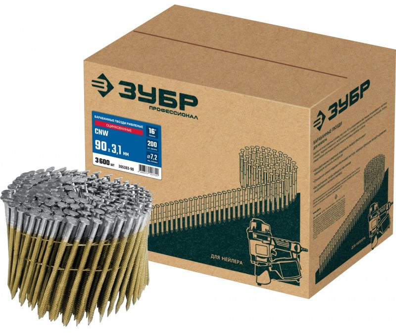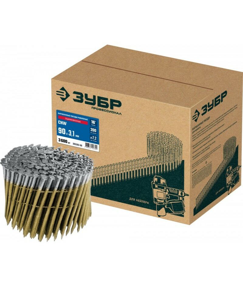 Барабанные гвозди рифленые оцинкованные Зубр CNW 90 х 3.1 мм 3600 шт [305383-90]