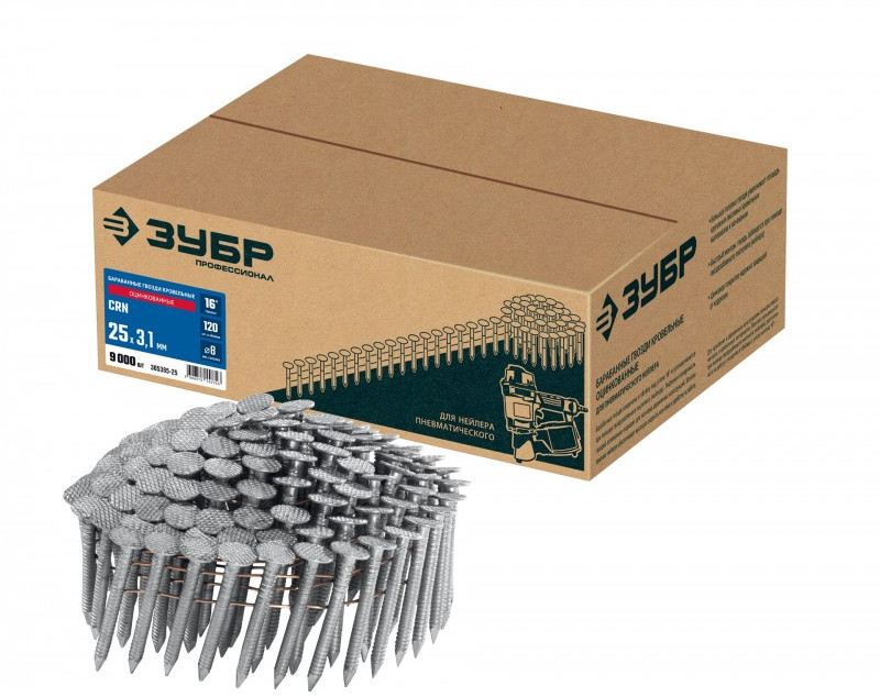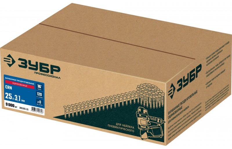 Барабанные гвозди кровельные Зубр CRN 25 х 3.1 мм оцинкованные, 9000 шт [305385-25]