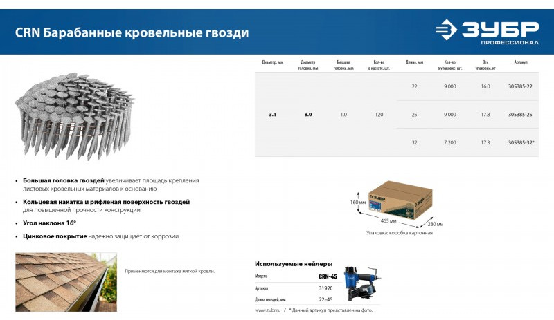 Для монтажа мягкой кровли. Монтаж производится при помощи гвоздезабивного пистолета (нейлера) ЗУБР CRN-45 (арт. 31920) или аналогичного, рассчитанного на работу с барабанными кровельными гвоздями с углом наклона 16 град.