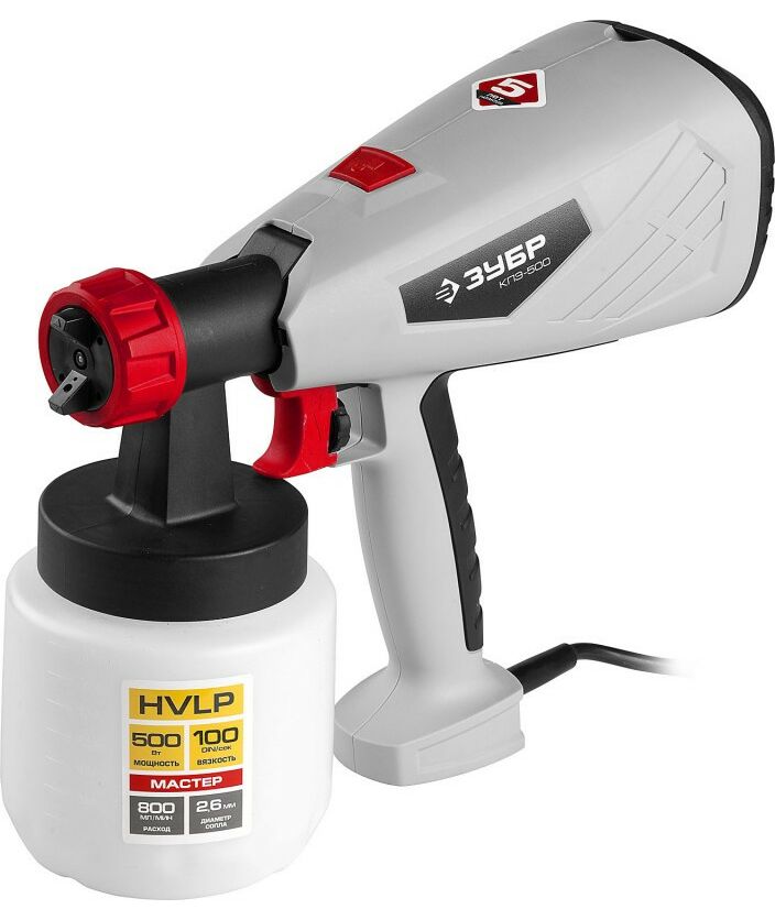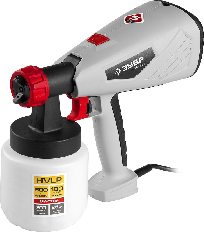 Краскопульт (краскораспылитель) электрический Зубр КПЭ-500 HVLP, 0.8л, краскоперенос 0-800мл/мин,вязкость краски 100 DIN/сек, сопло 2.6мм, 500Вт