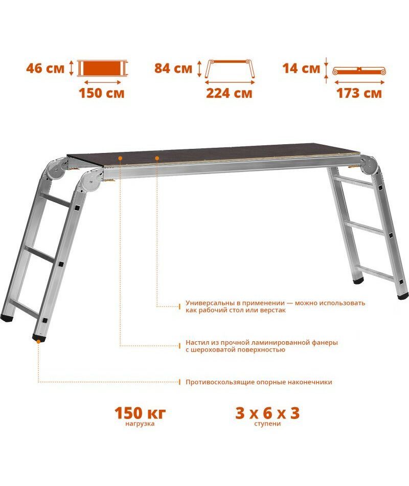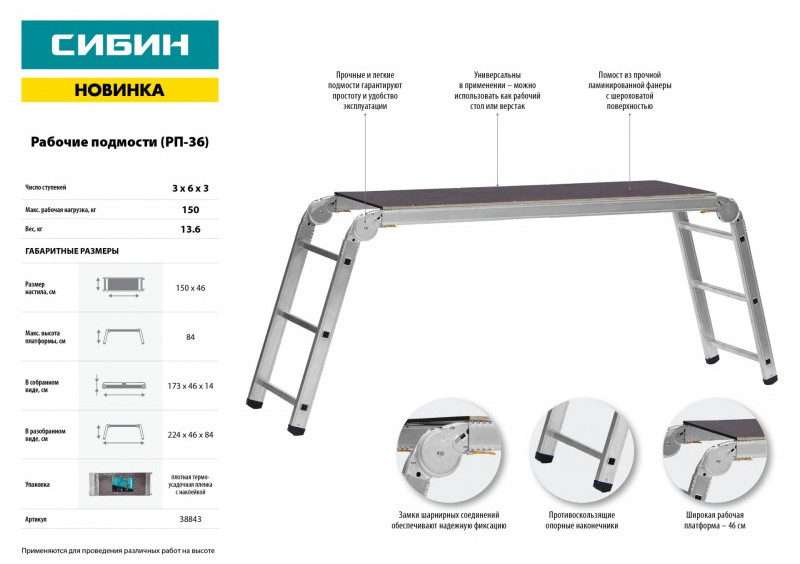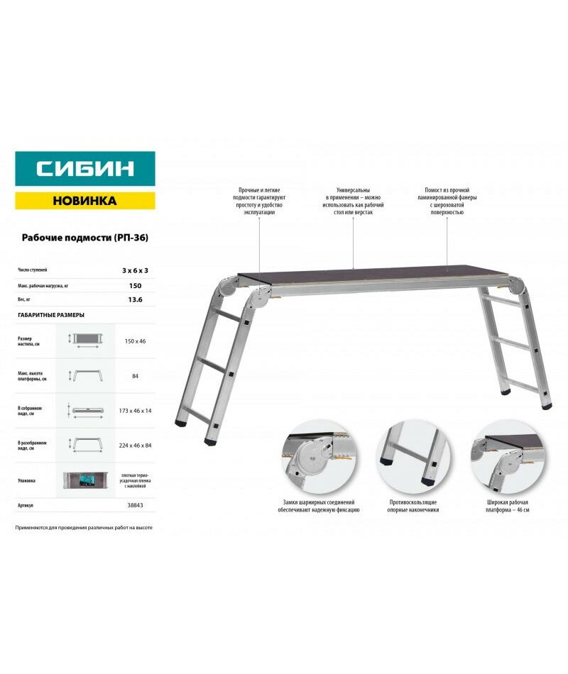 Рабочие подмости СИБИН РП-36 алюминиевые, 3х6х3 ступени, складные с фиксированной площадкой [38843]