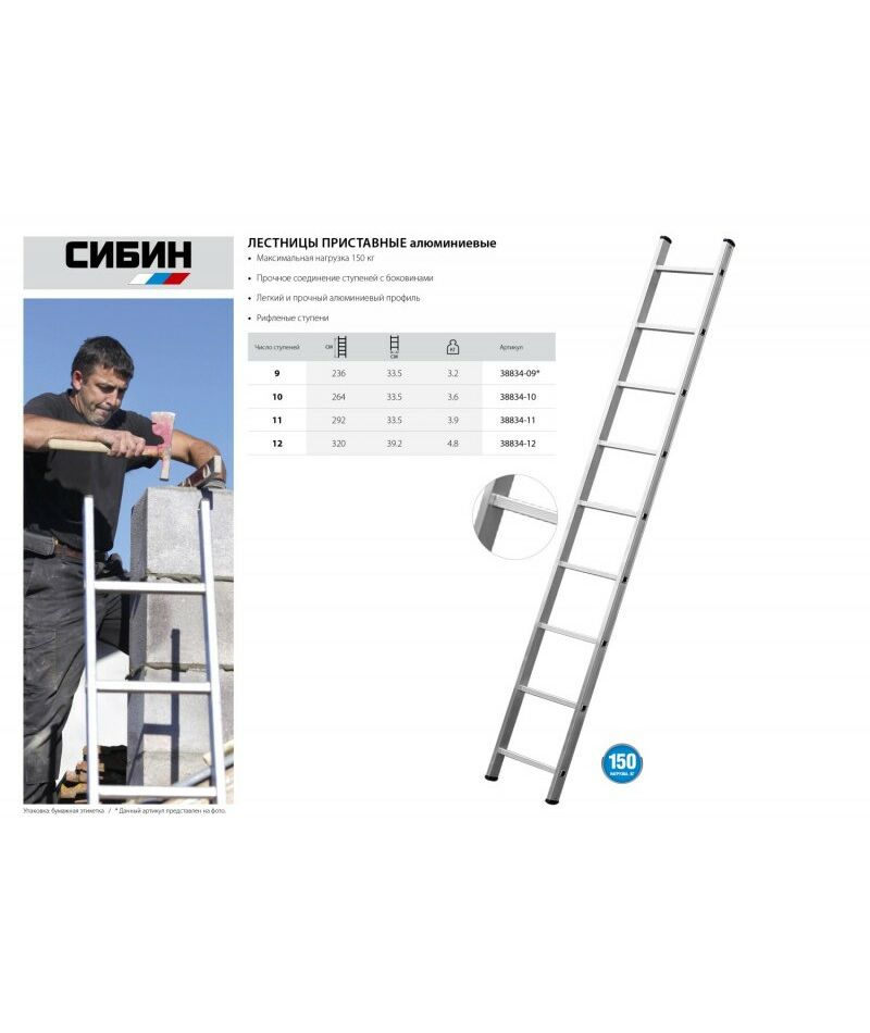 Приставная лестница СИБИН 38834-11 односекционная, алюминиевая, 11 ступеней, высота 307 см