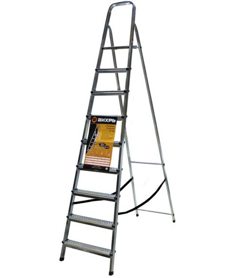 - Компактная и удобная в работе, широко применяется в быту. Прочный корпус изготовлен из стали. Покрыта гальваническим антикоррозийным покрытием. Односекционная модель с 8-ю широкими ступенями с рифленой поверхностью и рабочей площадкой. Чтобы стремянка не скользила, на опорах оборудованы заглушки. Также есть дуга безопасности. В сложенном состоянии модель очень компактна и занимает мало места.