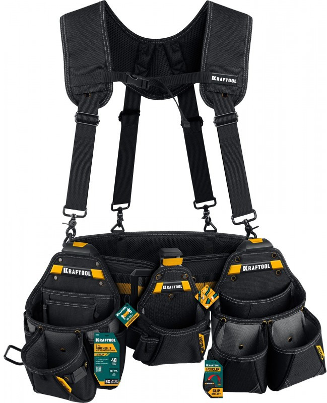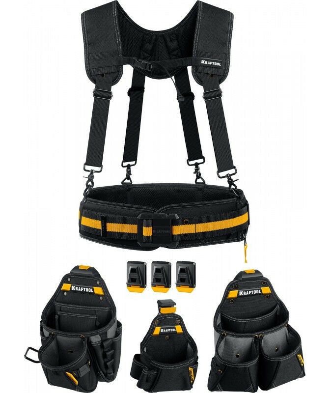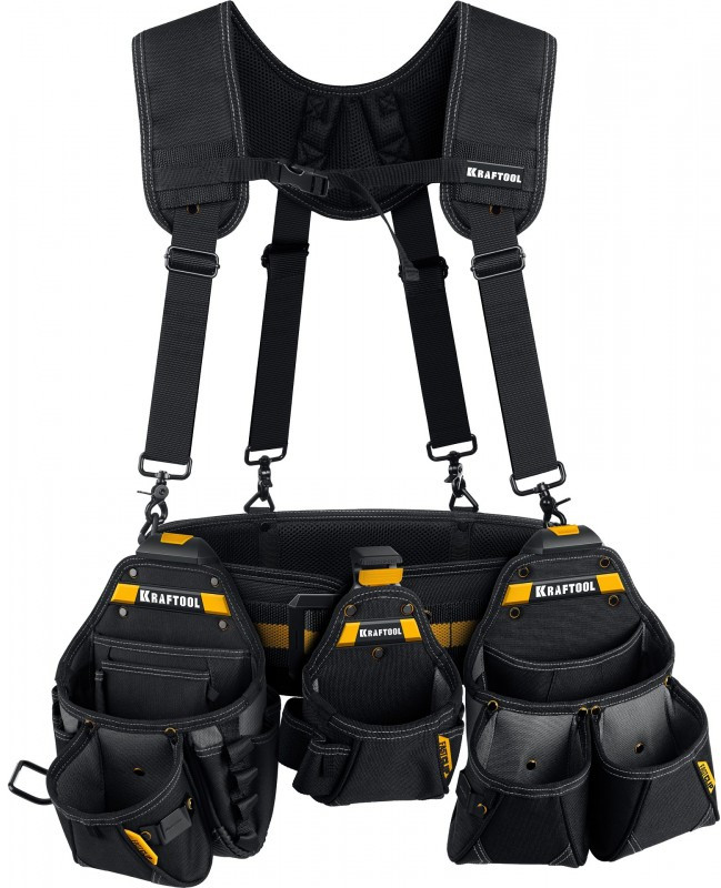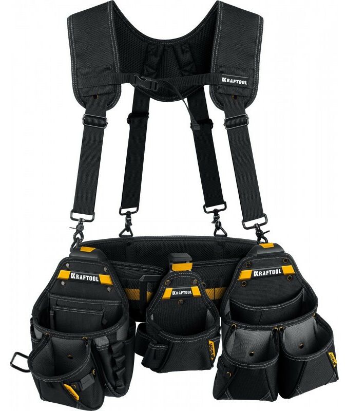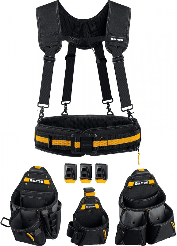 Пояс монтажника KRAFTOOL KBS-5 в комплекте: пояс монтажника, подтяжки и 3 сумки [38760-5]